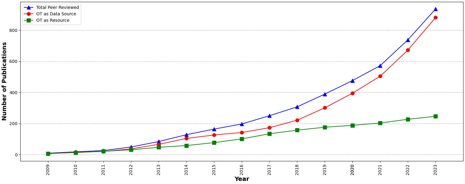 Primary support for OpenTopography comes from the Division of Earth Sciences at the U.S. National Science Foundation, and thus, our principal emphasis is on facilitating access to topographic data oriented towards Earth science research and education. In the context of academic research, publications are a crucial metric for measuring impact and sustaining support for initiatives such as OpenTopography. We actively monitor references to OpenTopography in the published literature using web-based searches of online journal databases, and annually compile this information for our use and for the benefit of the OpenTopography community.