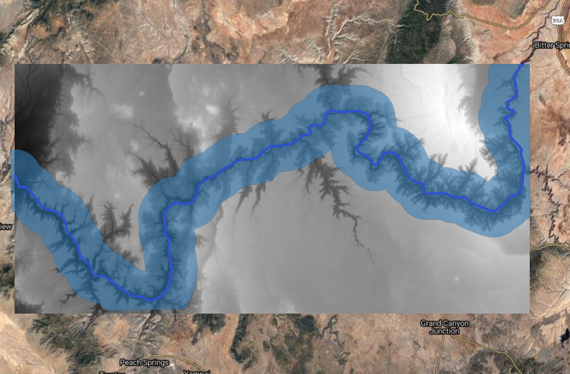 The notebook walks through a simple workflow using SRTM topography for the Grand Canyon in Arizona. Users will access the SRTM COGs via OpenTopography cloud storage; subset and mosaic the data; download, clip, and buffer a vector file of the Colorado River; and then clip the DEM to the buffered area. Below is a visualization of some of the steps users will work though as part of the Jupyter Notebook.