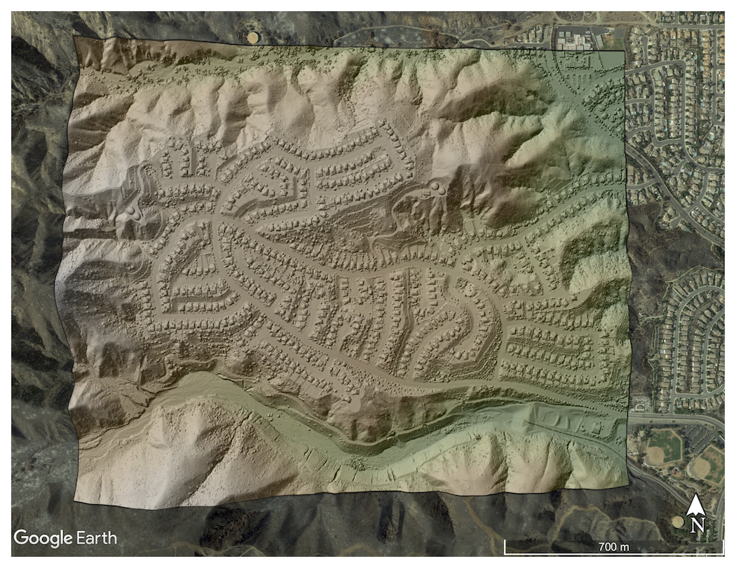 Colored hillshade of subdivision on eastern edge of hills impacted by wildfires near Lake Elsinore, CA. Base imagery provide by Google Earth. Data Source: Change Detection of Post-fire Runoff Events, CA 2019.