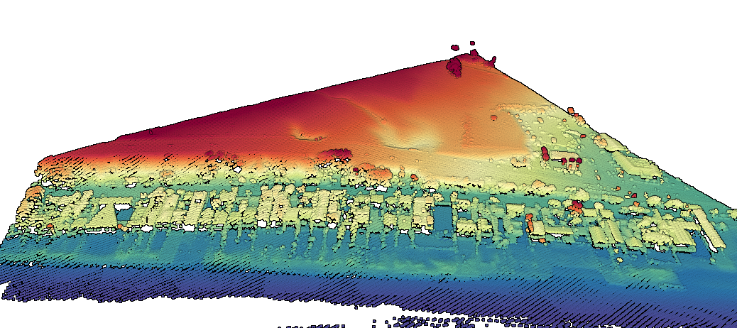 Point cloud colored by elevation of Malibu beach homes along the coastline.