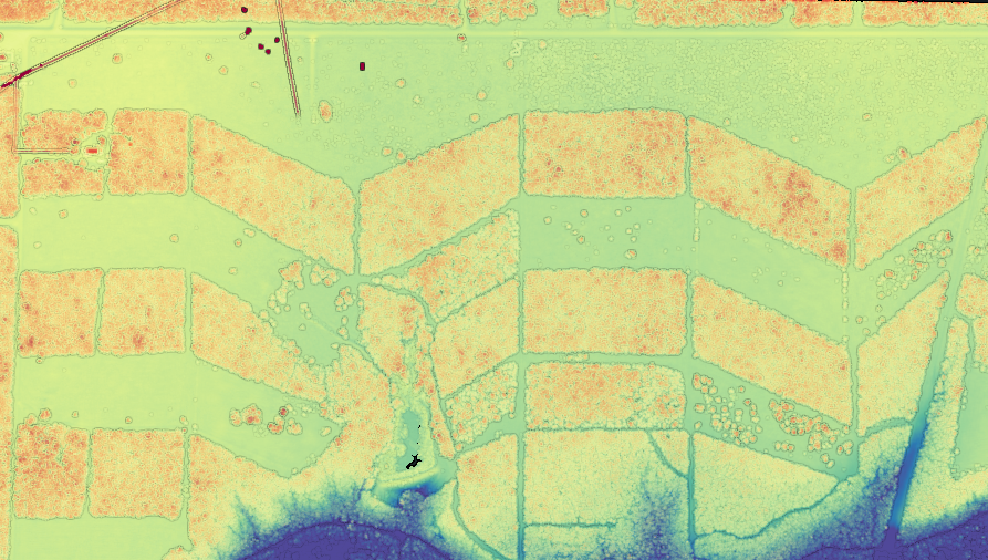 Lidar point cloud colored by elevation showing a unique agricultural landscape in Texas. Data Source: Post Hurricane Harvey Mapping of the Mission River, Texas 2018