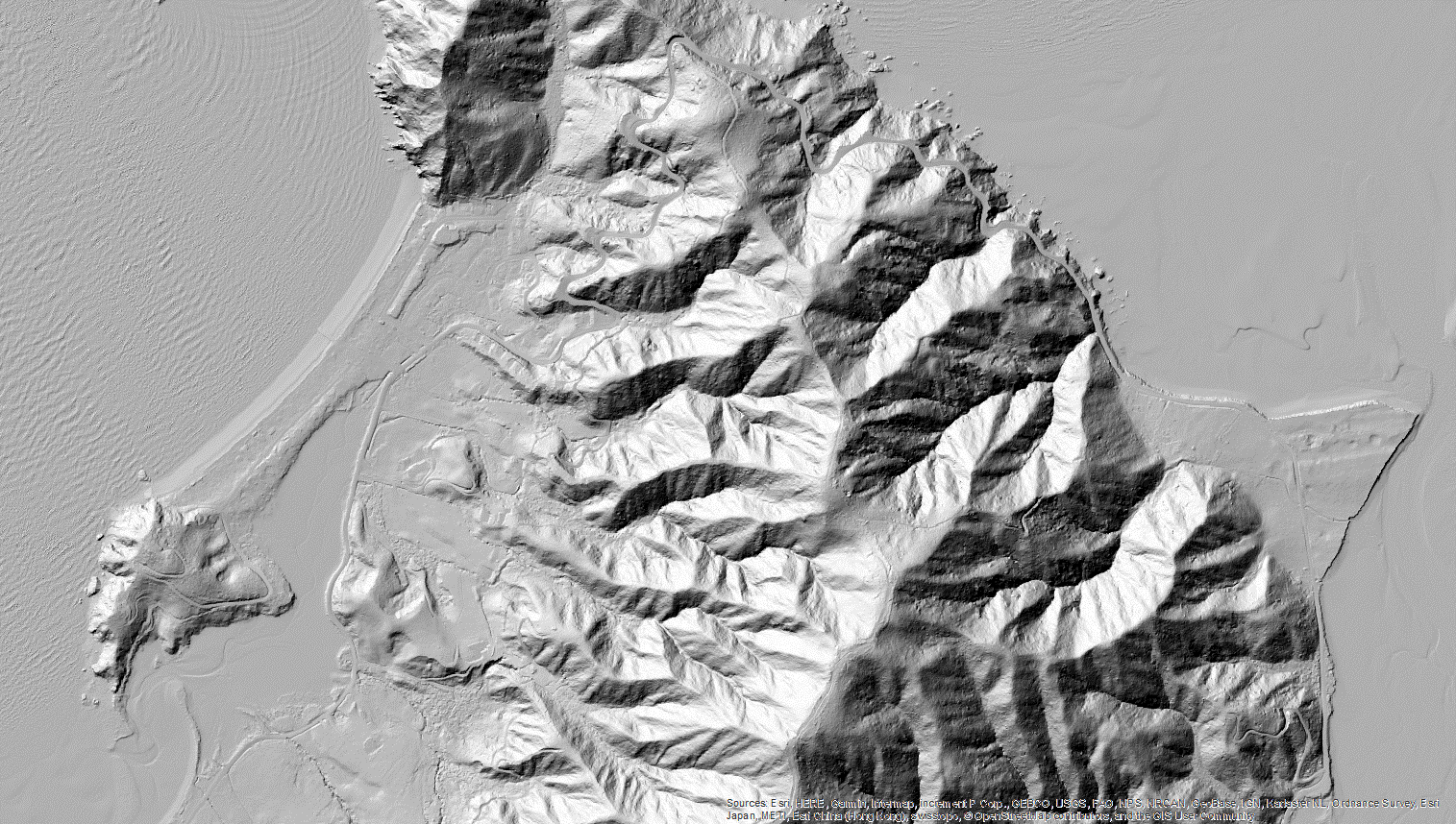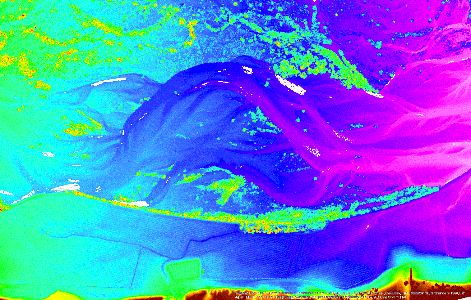 Left, An image derived from a Digital Surface Model (DSM) of the braiding of Wairau River, in the Blenheim, Marlborough, New Zealand 2014 dataset, colored by elevation, and, right, a grayscale hillshade of a DTM produced from the Abel Tasman and Golden Bay, Tasman, New Zealand 2016 dataset.