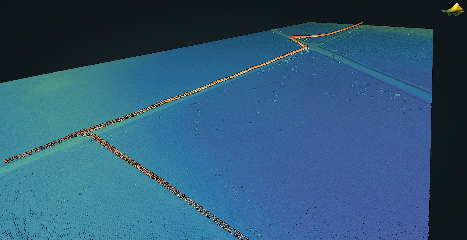 3D point cloud colored by elevation of a long, flat section of Kansas where the power lines are the highest point. Data Source: USGS 3DEP: KS 4Area 3 D23.