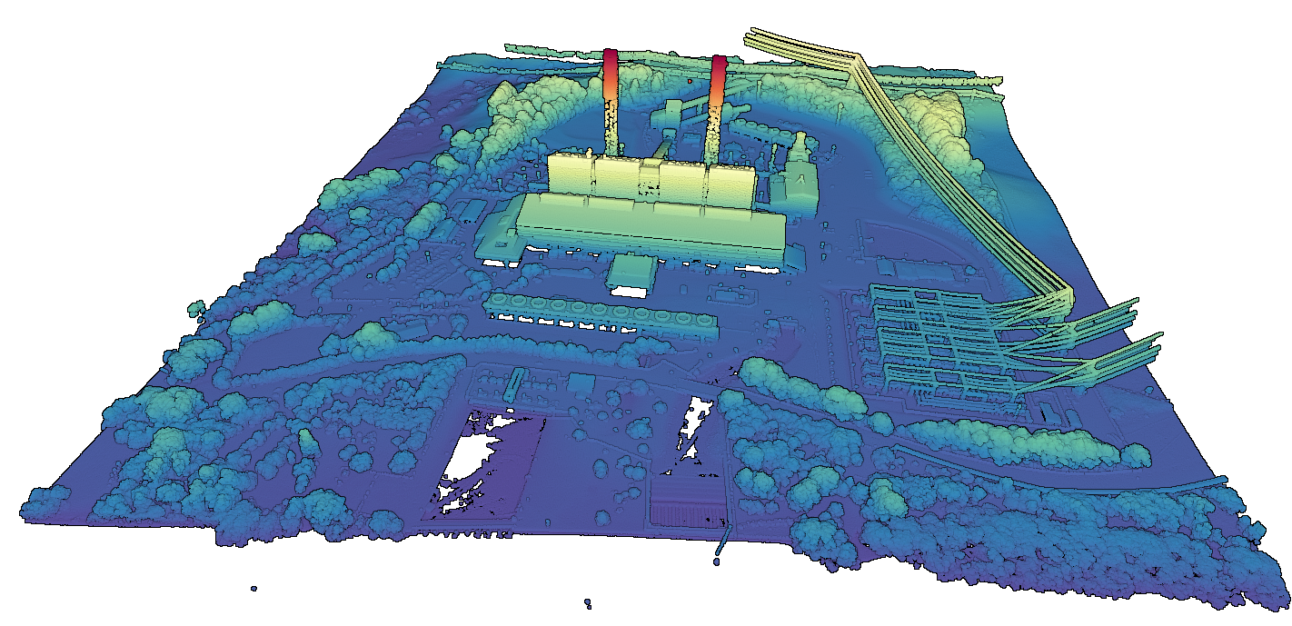 3D lidar point cloud colored by elevation showing a power plant in Huntly.