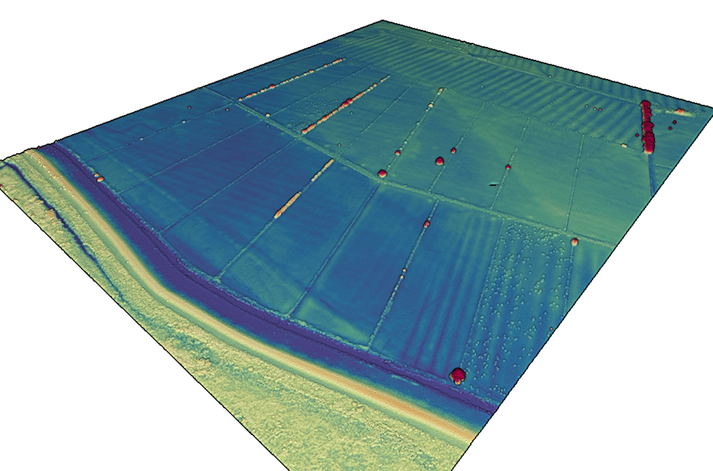 Farm animals in pasture Lidar data colored by elevation. Farm animals can be seen in pastures in lower right and upper left fields.