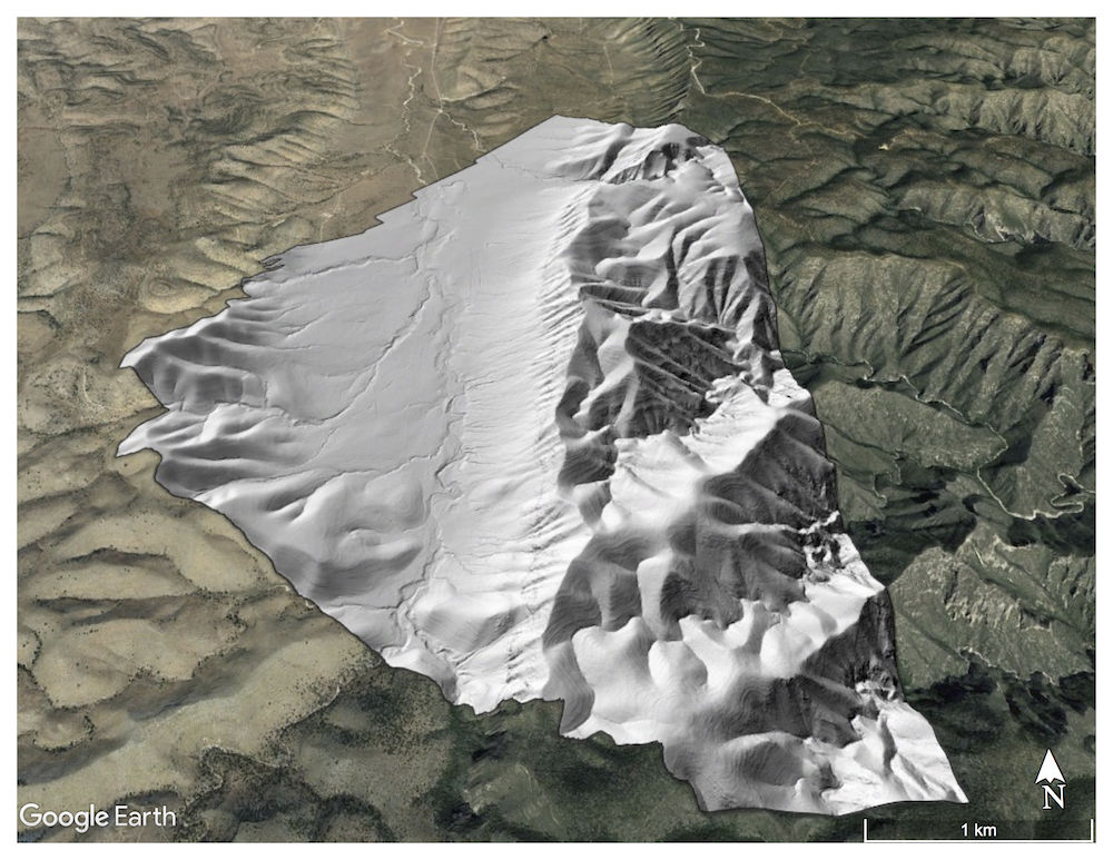 Hillshade of the digital terrain model (DTM) of the western region of the Guadalupe Mountains draped on Google Earth imagery.