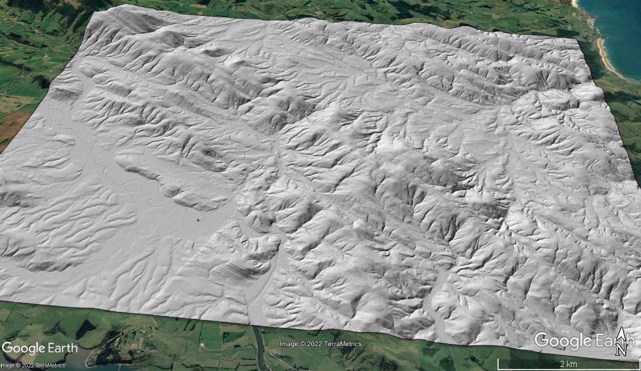 Bare earth lidar hillshade of the Owaka region in Otago, New Zealand overlain on imagery accessed from Google Earth.