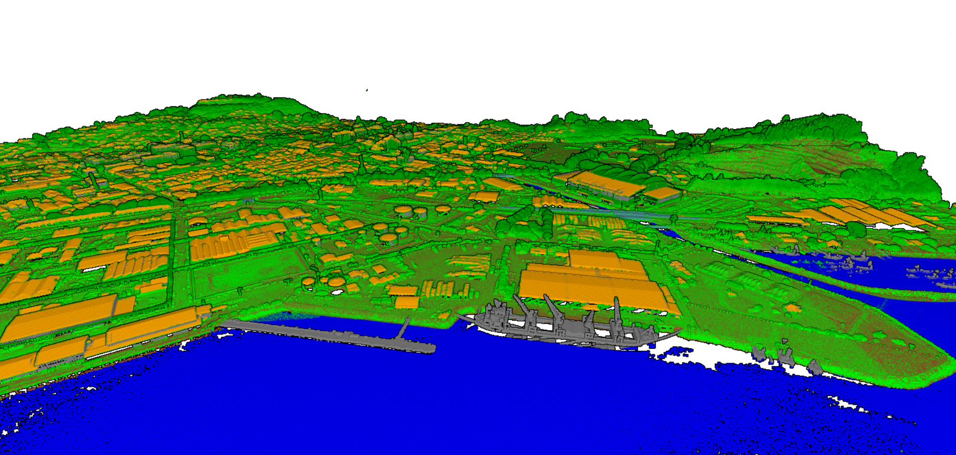 3D point cloud colored by return classification of Port Otago in Dunedin, New Zealand (Brown=ground, green=vegetation, orange=buildings, blue=water).