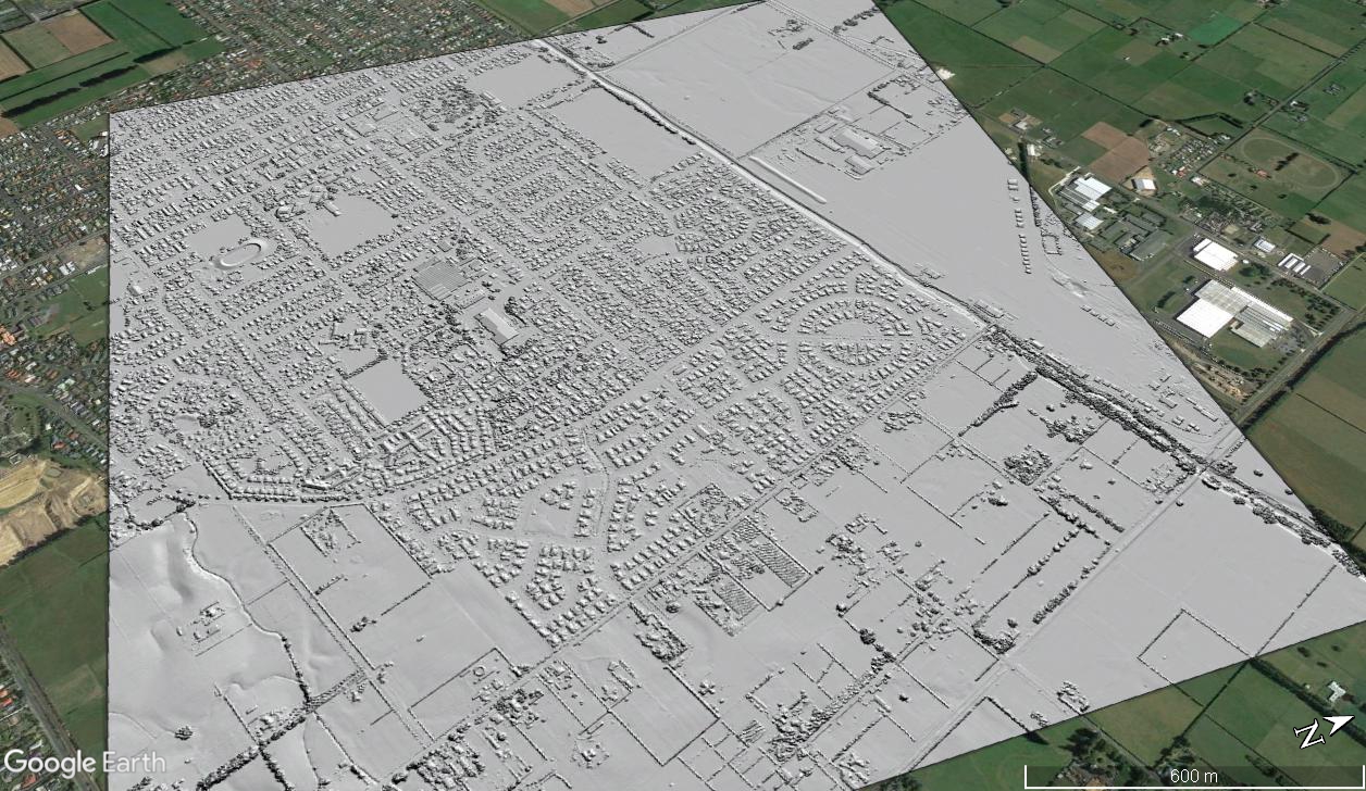 Hillshade of Mosgiel, New Zealand draped over Google Earth imagery.