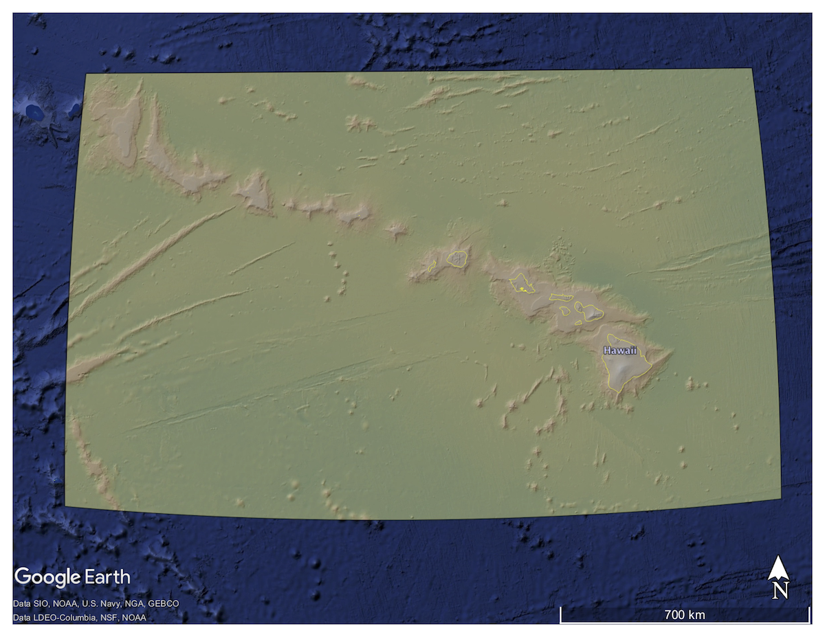 Colored Digital Elevation Model of the Hawaiian Archipelago and its bathymetry draped on Google Earth imagery