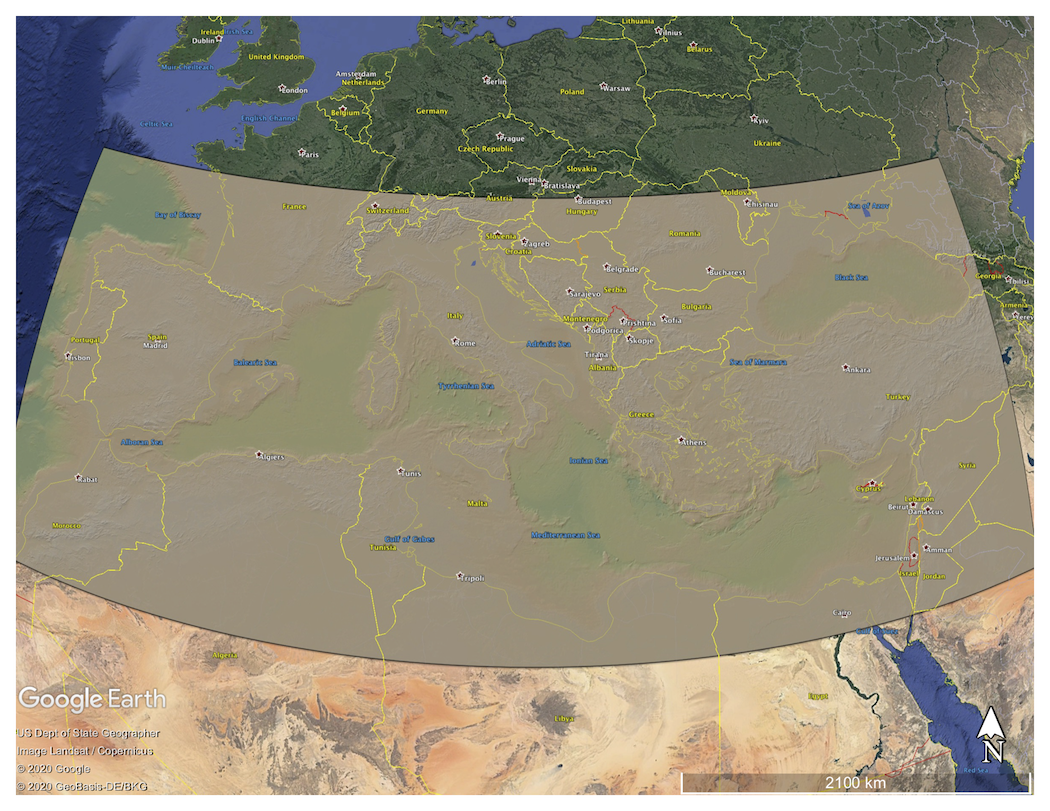 Colored Digital Elevation Model (DEM) of the Mediterranean Sea draped on Google Earth imagery