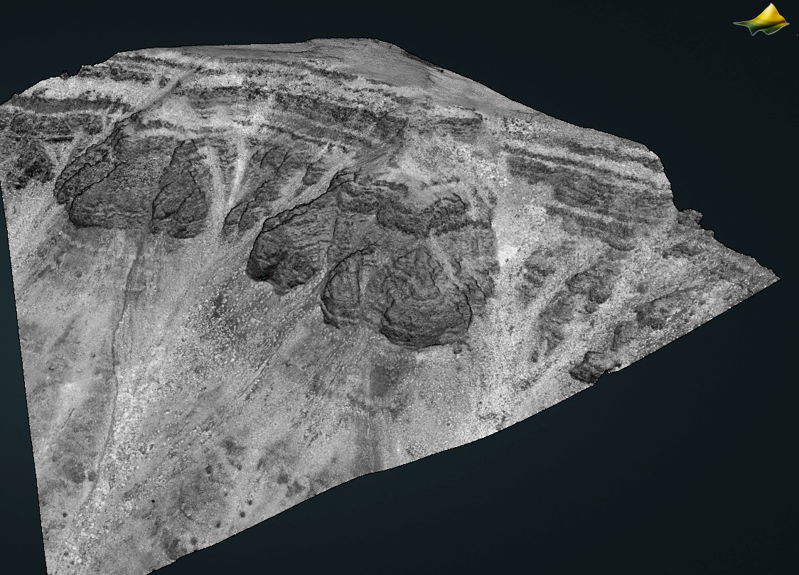 Point cloud colored by intensity of a section of Steens Mountain in Oregon. Data Source: USGS 3DEP Lidar: OR SouthEast 8 D22