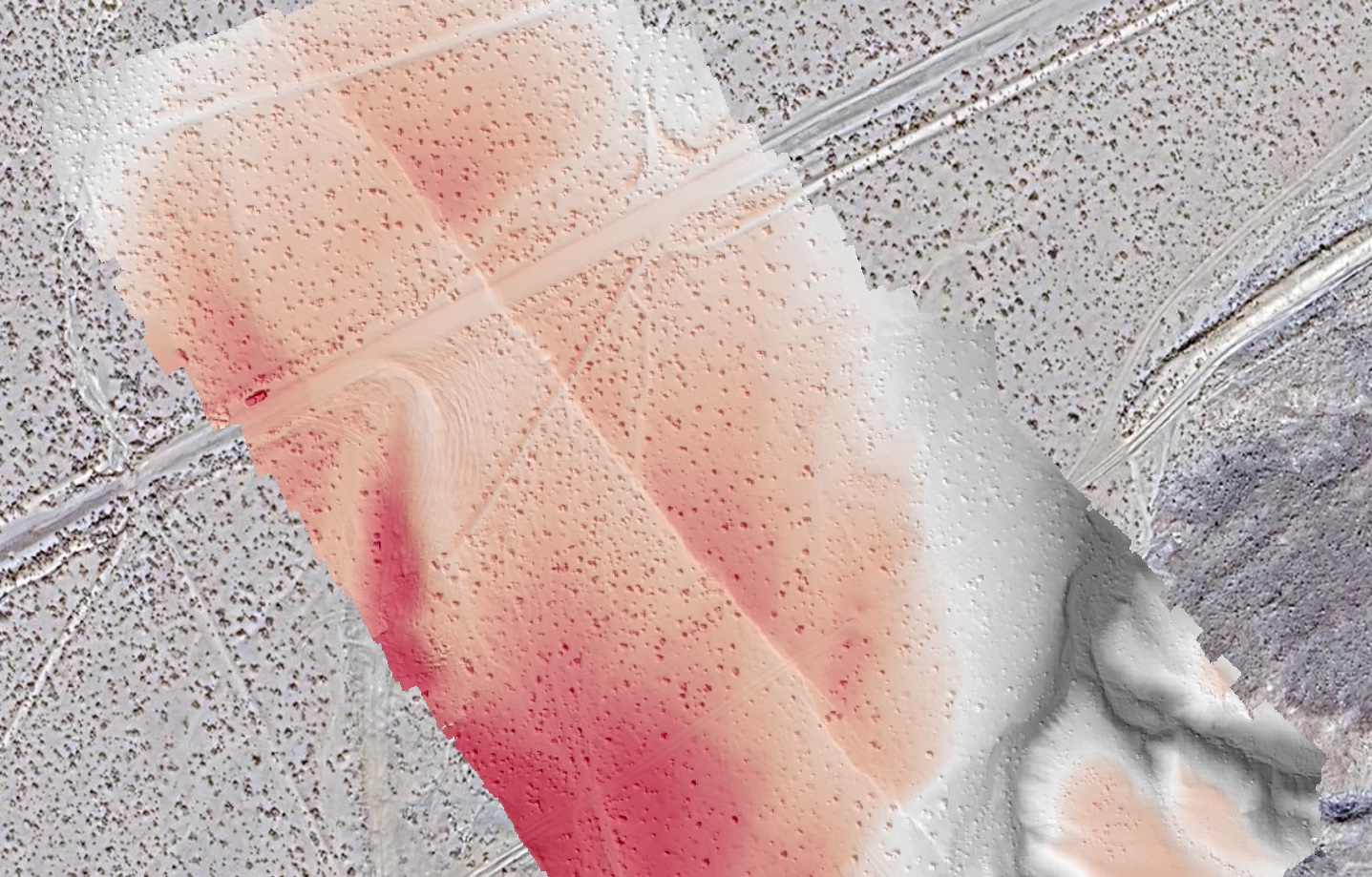 Colored hillshade covering a portion of the 2019 M7.1 Ridgecrest earthquake surface rupture in California (red is higher elevation, grey is lower elevation). Data Source: CDS: High-Res SfM Topography of a Portion of the 2019 M7.1 Ridgecrest Rupture.
