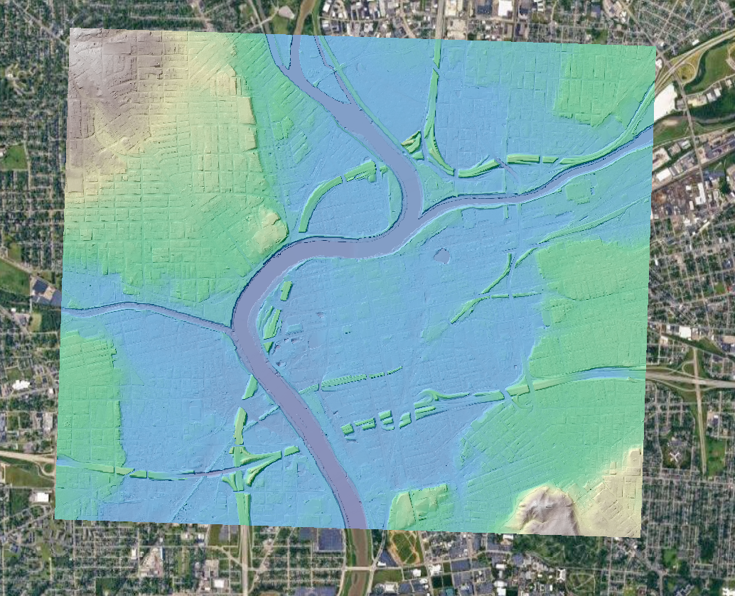 Colorized hillshade of the USGS 1m DTM data over Dayton, Ohio. Note this dataset is a hydro-flattened digital terrain model, so it has buildings, bridges, and overpasses removed. Data Source: USGS: USGS 1 meter Digital Elevation Model.
