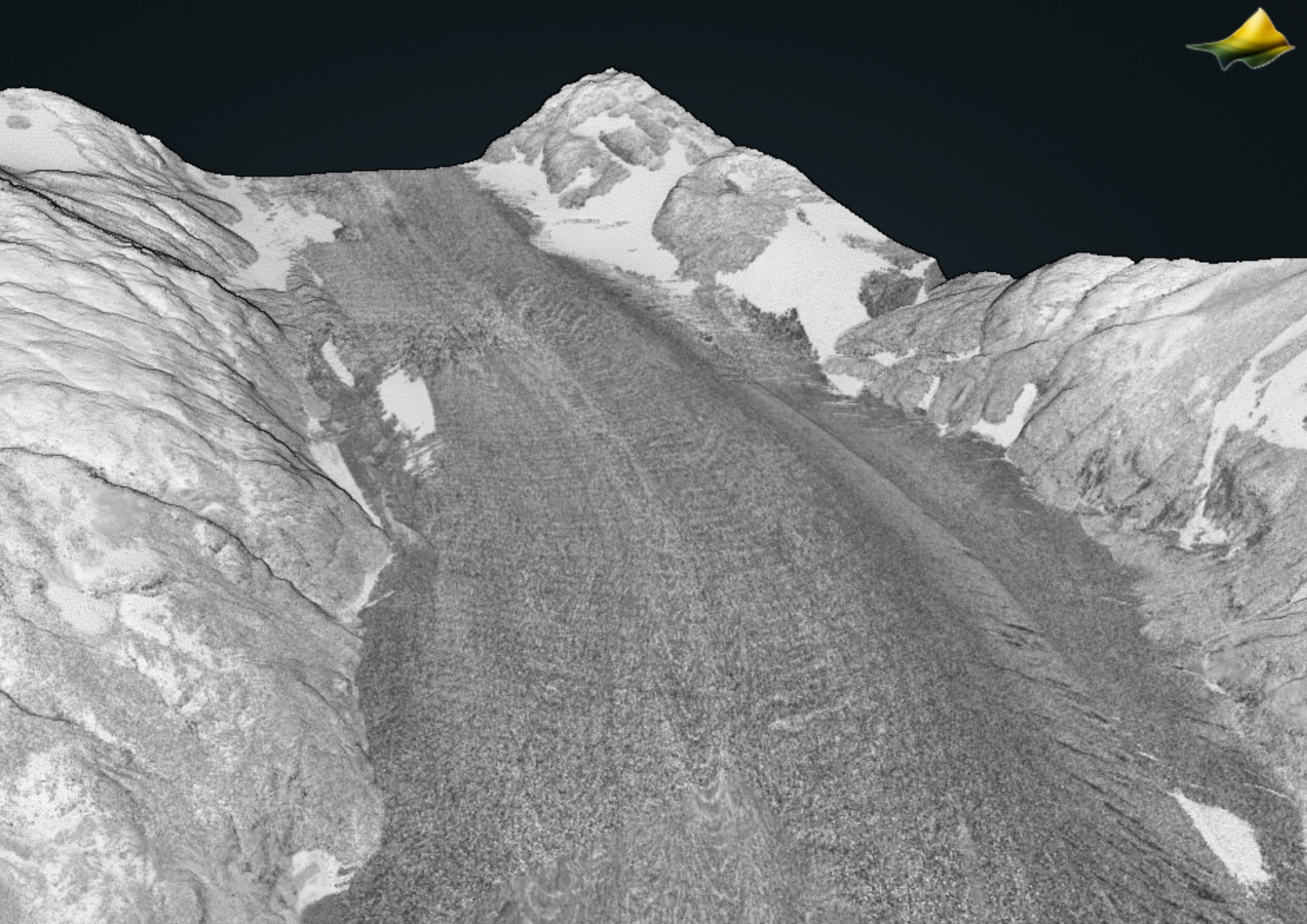 3D point cloud of intensity of a glacier near Kachemak Bay, Alaska. Data Source: NOAA: 2024 NOAA Lidar: AK Coastal Communities (Kachemak Bay).