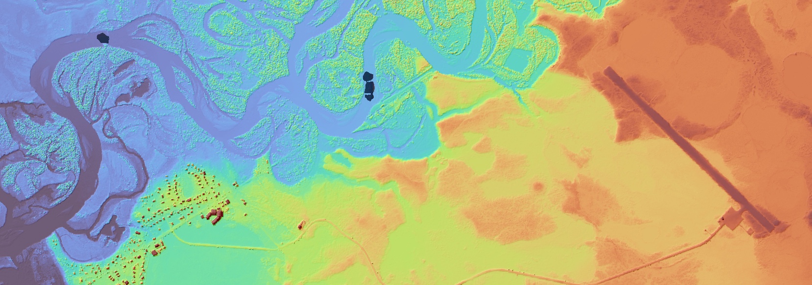 Colorized hillshade of Quinhagak, Alaska. Data Source: NOAA: 2024 NOAA Lidar: AK Coastal Communities (Eek, Goodnews Bay, Nelson Lagoon, Quinhagak, Togiak).