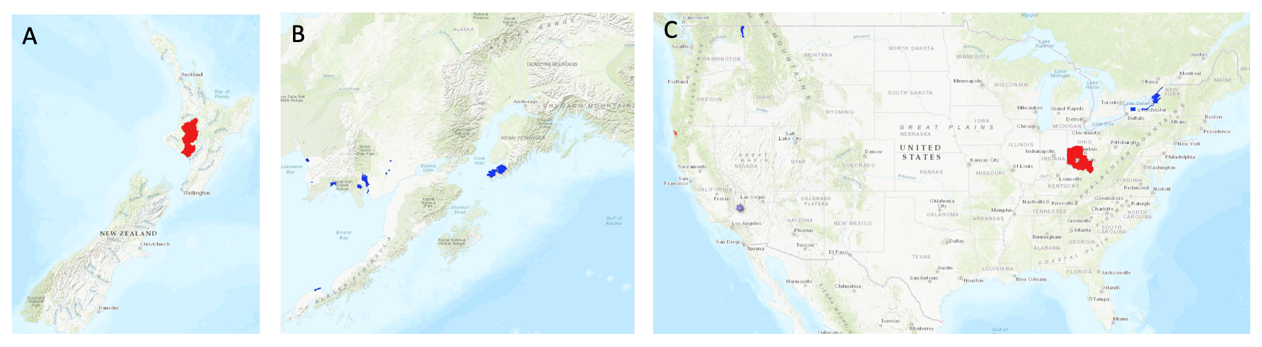 A. Location of new LINZ dataset in red in New Zealand. B. Location of new NOAA datasets in Alaska in blue. C. Location of new USGS 3DEP 1 meter data in red, new NOAA datasets in blue, and a new Community Dataspace dataset near Ridgecrest, CA in purple.