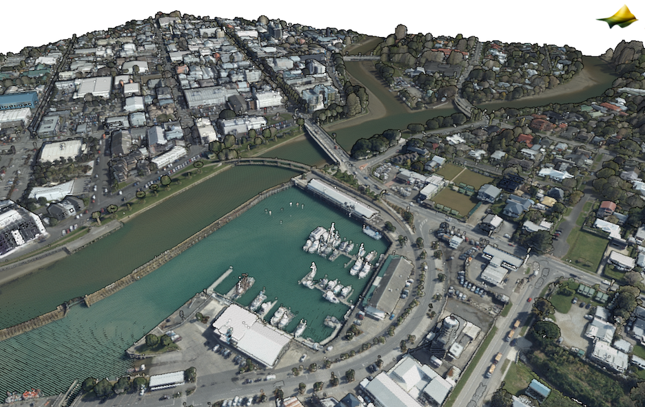 Downtown Gisborne 3D point cloud colored by RGB values from imagery. (Data from: Gisborne, New Zealand 2023)
