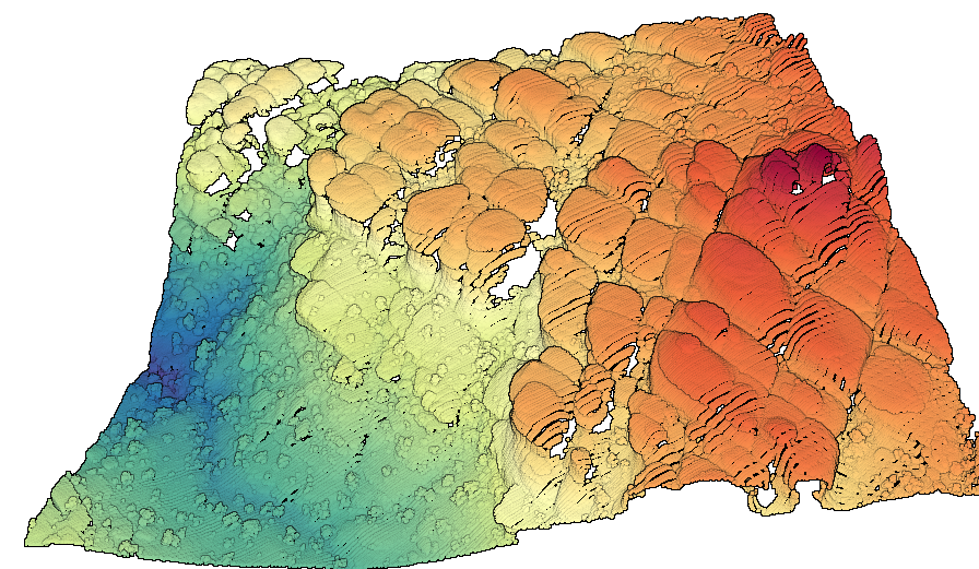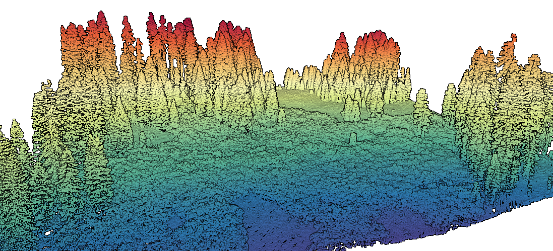 3D point cloud of a forested meadow with points colored by elevation. Data Source: Study in Erosion Response: Horse Linto, CA 2019