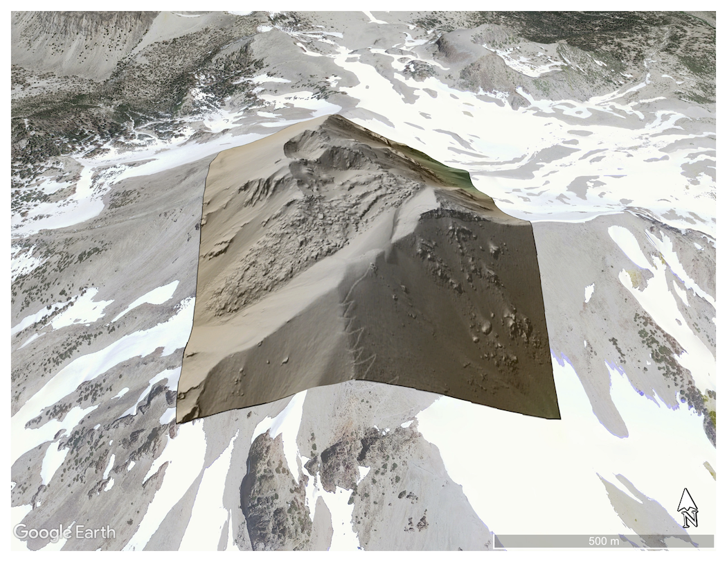 Digital Terrain Model (DTM) of Lassen Peak draped over Google Earth imagery. Switchbacks of trail to summit can be seen in the foreground.