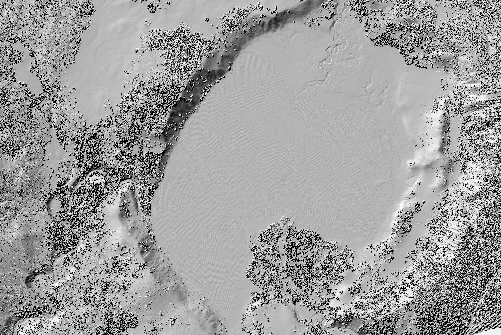 A shaded relief image derived from a Digital Surface Model (DSM) of Turbid Lake, in the Mapping of Hydrothermal Explosion Craters in Yellowstone N.P., WY 2017 dataset, left, and a visualization of the Mapping of Diamond Fork River, UT 2017 dataset, right, colored by elevation, made with OT’s browser-based 3D visualization tool.