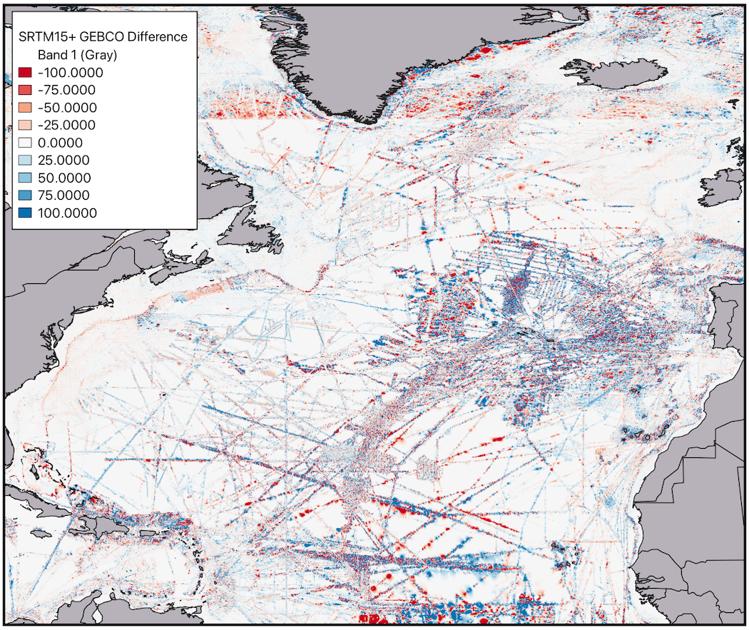 Map of the Atlantic showing the difference between the SRTM15+ bathymetric grid and the GEBCO_2023 bathymetric grid.
