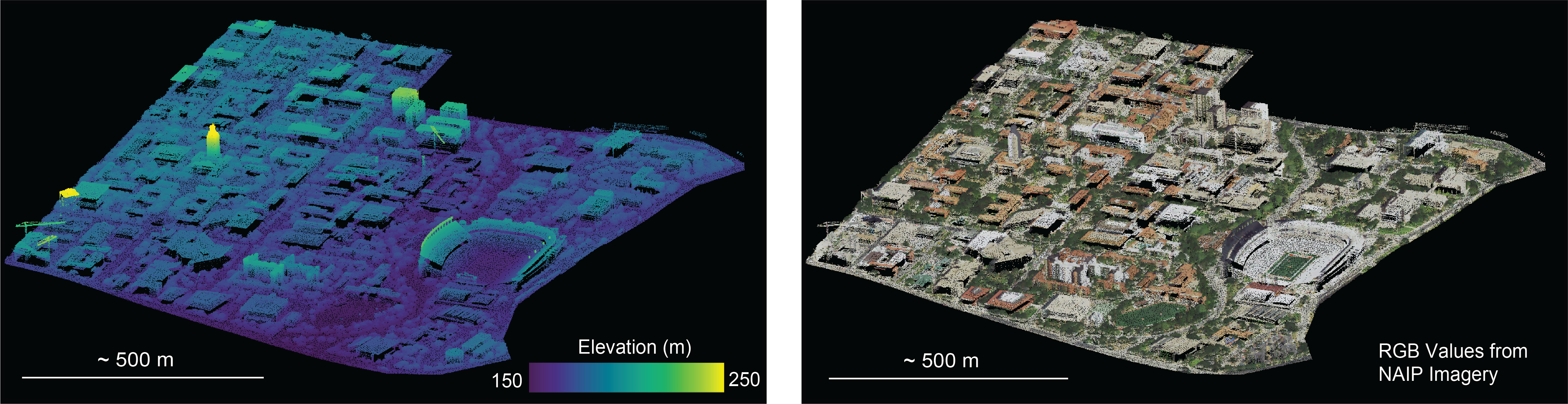Lidar point cloud covering the University of Texas at Austin campus (Austin, Texas). (Right) Point cloud data colored by elevation. (Left) Point cloud data colored by RGB values from co-located National Agriculture Program (NAIP) 1-meter imagery. Visualized in CloudCompare.
