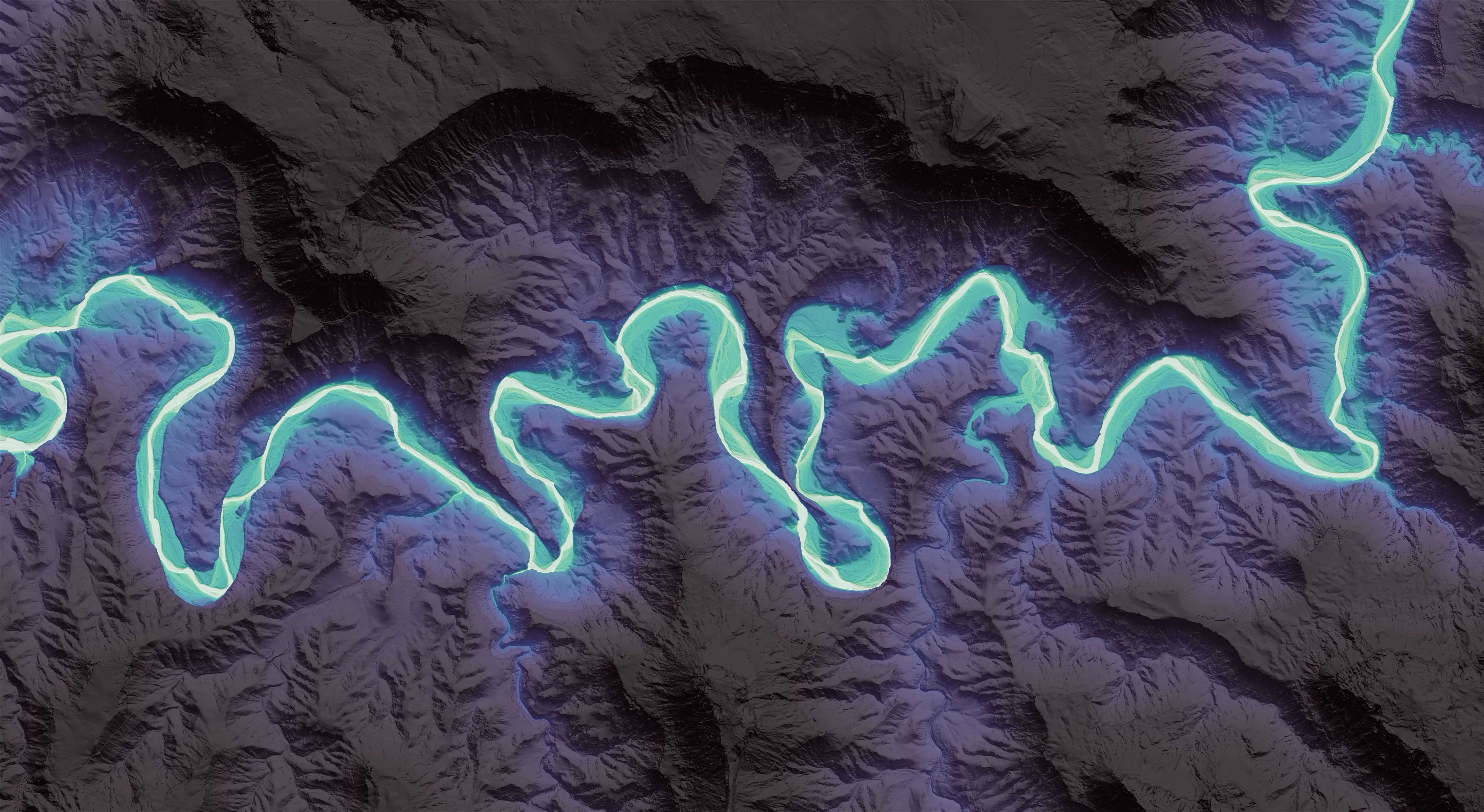 • Apply coloring and visualize: To visualize the REM, we can apply a color mapping to the REM values. In order to emphasize elevation differences very close to the river, where relevant features like relic channels, scroll bars, and floodplains are present, we apply a colormap that scales with the logarithm of REM elevations. That way, more color variation is present closer to the river channel. This colored REM is also blended with a hillshade in order to further emphasize topographic differences.