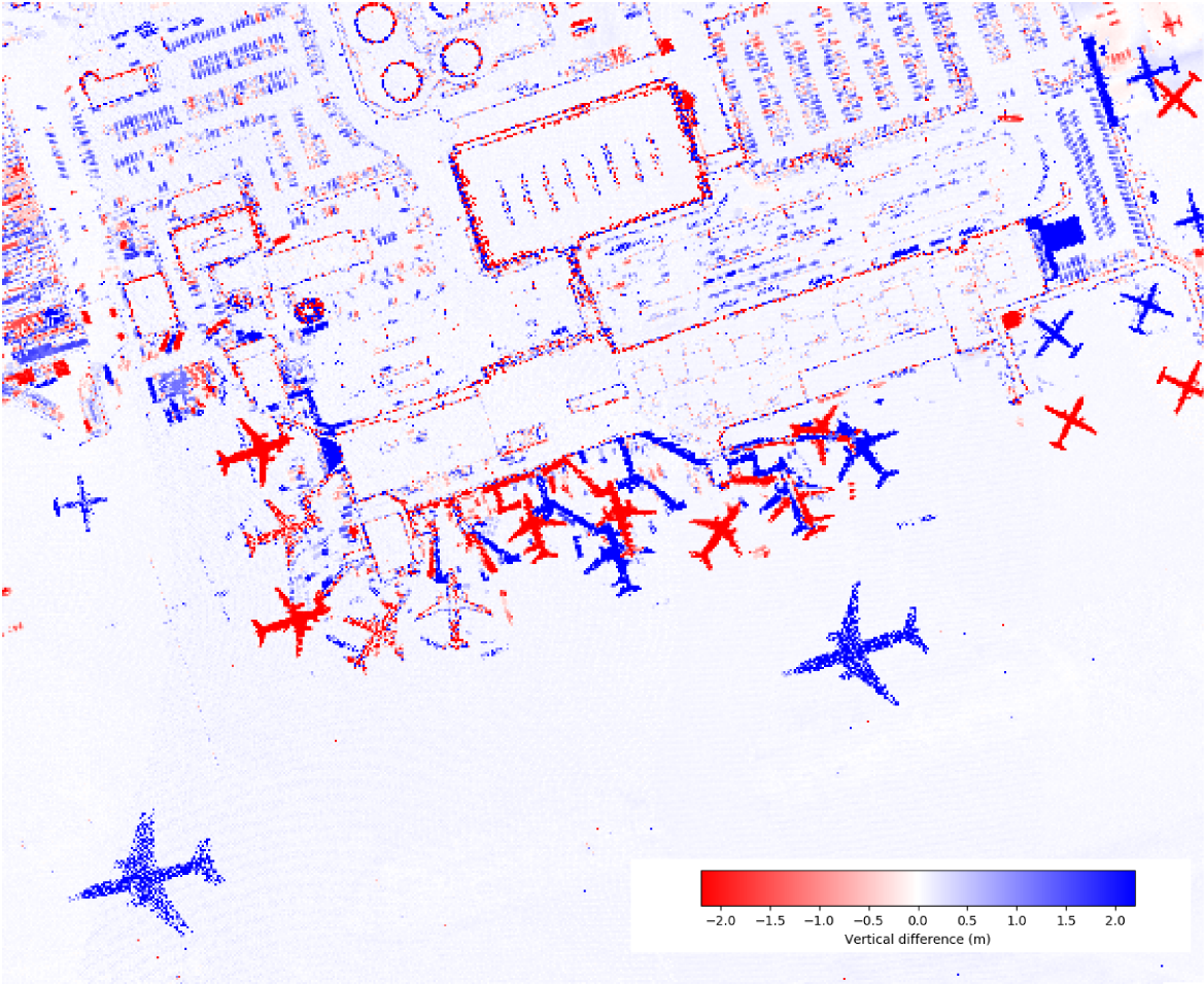 This example shows airplane movement at the Auckland Airport. Do the red planes indicate airplane position during the 2013 or the 2016 acquisition? What about the blue planes? Test your answer with the slider in the image above. (Answer: Red represents airplanes during the first acquisition in 2013, and blue represents airplanes during the 2016 acquisition.)
