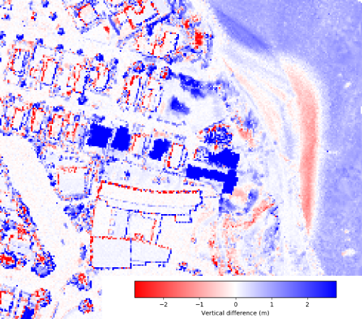 This example shows the construction of housing and other buildings near the beach in Wellington and is made by differencing digital surface models (DSM). DSMs represent the elevation of the top of the landscape from the natural and built environment. DSM differencing over the built environment, like this example, supports work in infrastructure asset management aimed at efficiently locating new developments as well as changes to buildings.