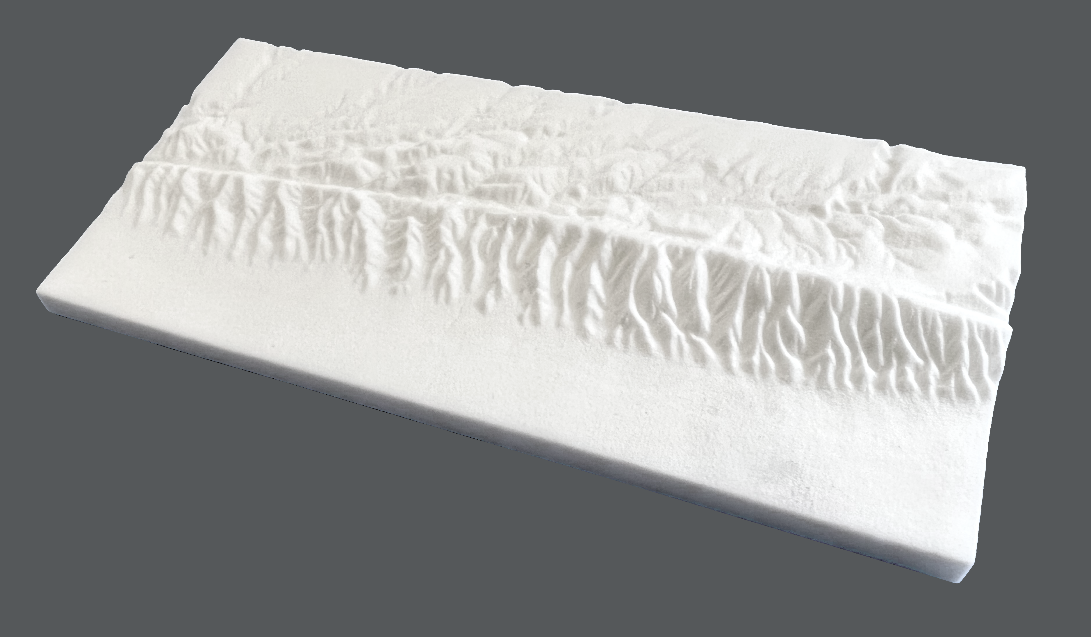 | Lateral moraines of the Teton Front Range, Wyoming. FDM print with PLA filament. | Landslide in the Alaska Range along Denali-Totschunda Fault System, Alaska. FDM print with PLA filament. |