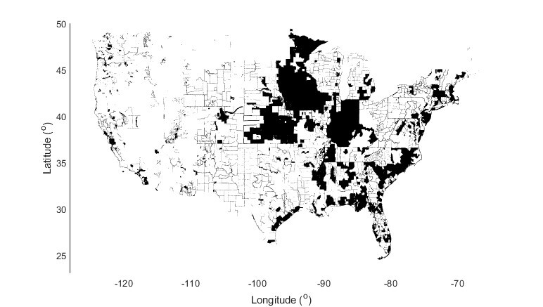 Spatial coverage of CONUS covered by two or more overlapping USGS 3DEP and NOAA lidar topography collections colored in black. We estimate that topographic differencing should be possible over ~20% for CONUS today.