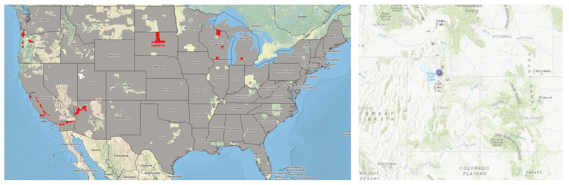 Left hand panel shows the location of existing USGS 3DEP 1 meter coverage (gray), and areas where new 1 meter data were added in August (red). The right hand panel shows the location of a new Community Dataspace dataset in Utah, east of Ogden.
