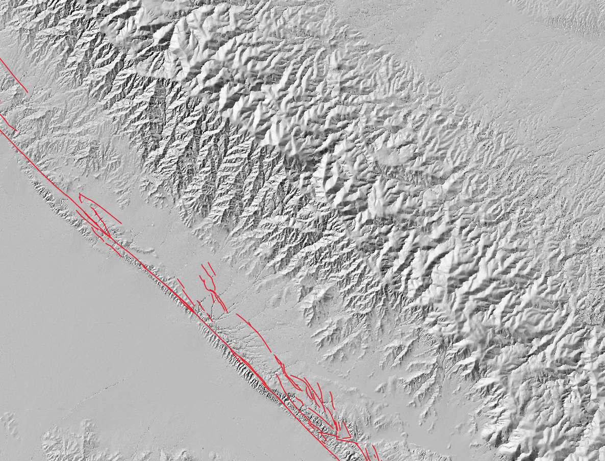 Hillshade of a section of the Carizzo Plain in California with the San Andreas fault zones plotted in red. Fault boundaries downloaded from the USGS Quaternary Fault and Fold Database of the United States. Data Source: OT: USGS 1 meter Digital Elevation Model.