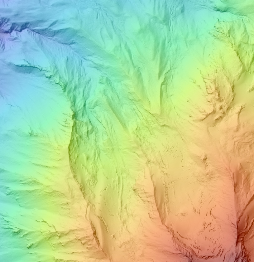 Colored hillshade of Mt Jefferson, Oregon. Data Source: OT: USGS 1 meter Digital Elevation Model.