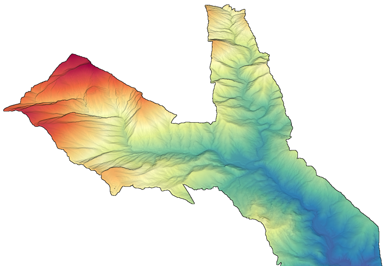 3D point cloud colored by elevation of the Marble, Middle and East Forks of the Kaweah River in the Sierra Nevada mountains in California.