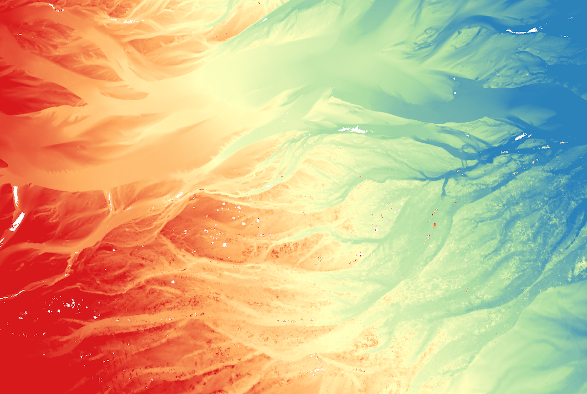 DIgital Terrain Model (DTM) colored by elevation showing braided streams in the Marlborough region of New Zealand.