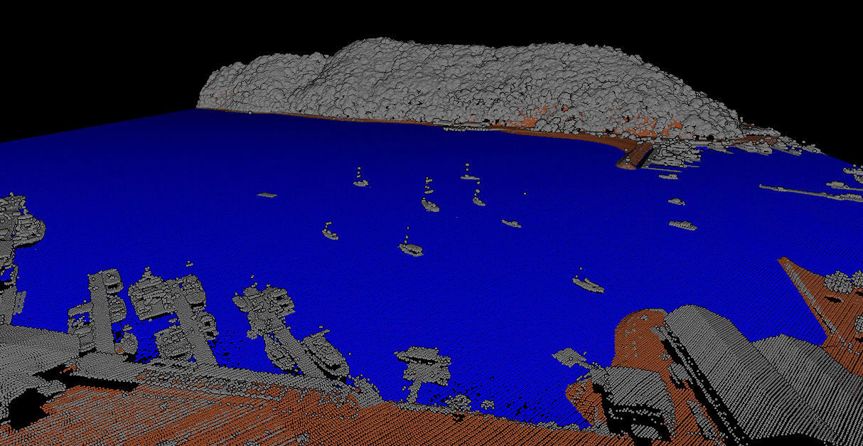 Lidar data colored by classification showing sailboats in Picton Harbor