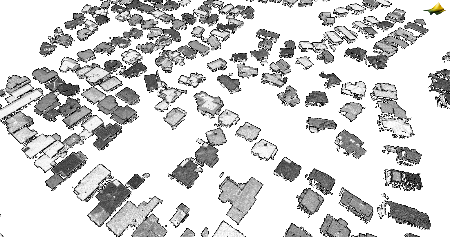3D point cloud colored by intensity of a suburban housing area filtered to return only points with a building classification (class 6).