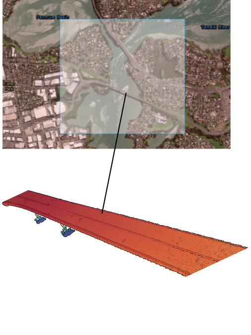 The dataset, "Auckland Part 1, New Zealand 2024" has a "Bridge Deck" classification. Using the advanced classification filters, the bridge deck class was selected and only those points with a classification value of 17 were returned. This image shows the job selection area over the Tamaki River in New Zealand, and a 3D point cloud representation of just the points classified as "Bridge Deck". Points are colored by elevation value.