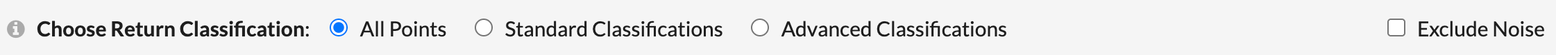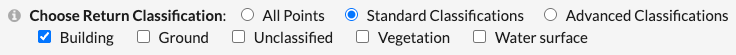 The user interface presents these standard classifications as check boxes, allowing users to mix and match as needed. The menu will present only those classification values that are available in each dataset. Note that noise values (classes 7 & 18) are automatically excluded in the standard classification profiles.