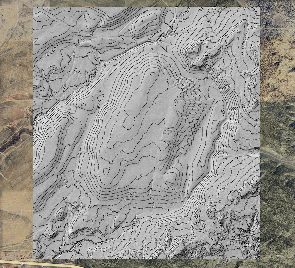 Hillshade with custom contours of the McKinley Mine. Data Source: Lidar Survey of the McKinley Mine, NM 2023