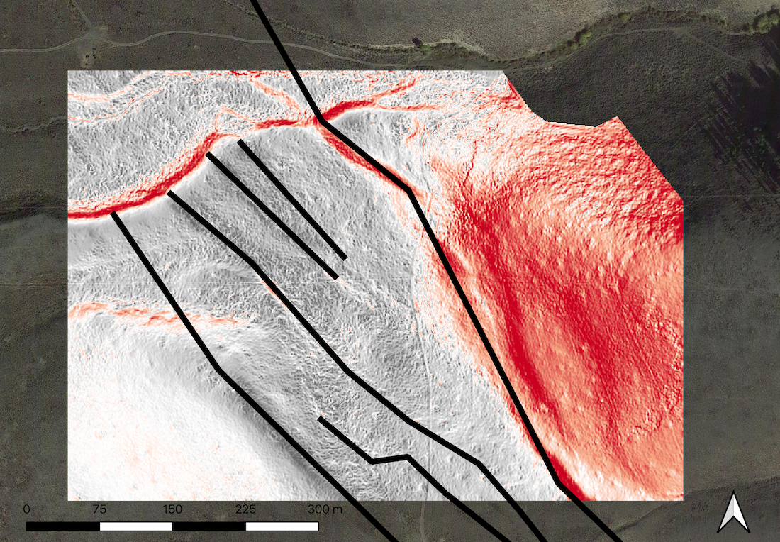 Hillshade of a digital surface model (dsm) showing the Borah Peak earthquake ground rupture scarp.