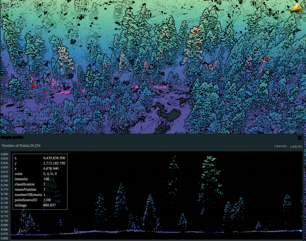 3D Point cloud of eastern edge of Sequoia National Park. Lower panel contains a 2D profile of the forest. A Giant Sequoia in the profile is roughly 170 feet tall.