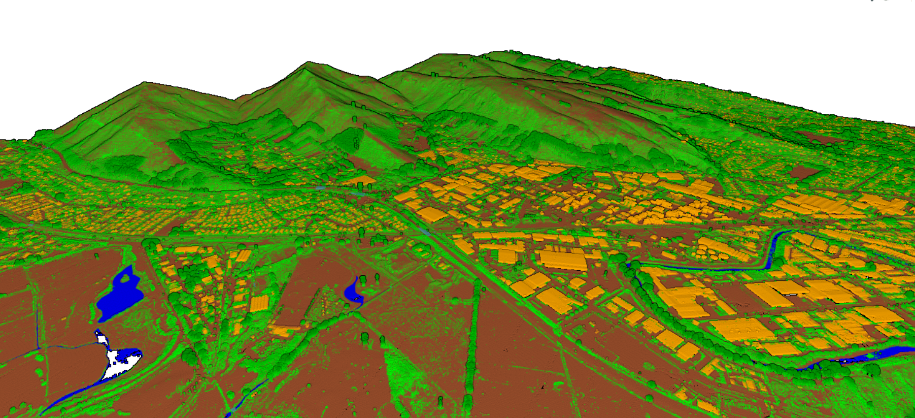 3D point cloud colored by return classification Christchurch, Canterbury, New Zealand (Brown=ground, green=vegetation, orange=buildings, blue=water).