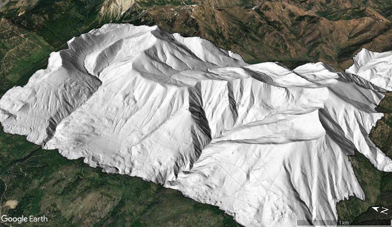 Digital terrain model (DTM) of the Eastern Cascade Mountains in Washington State overlain on Google Earth imagery
