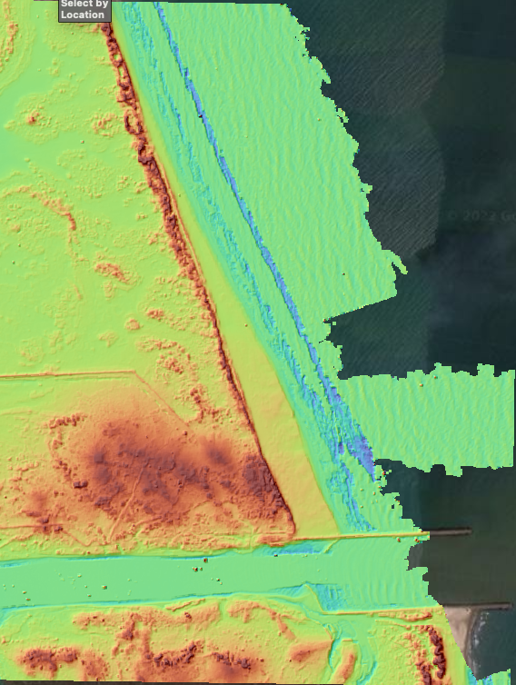 Hillshade draped on a Digital Surface Model (DSM) colored by elevation of the Port Mansfield Channel on Padre Island.