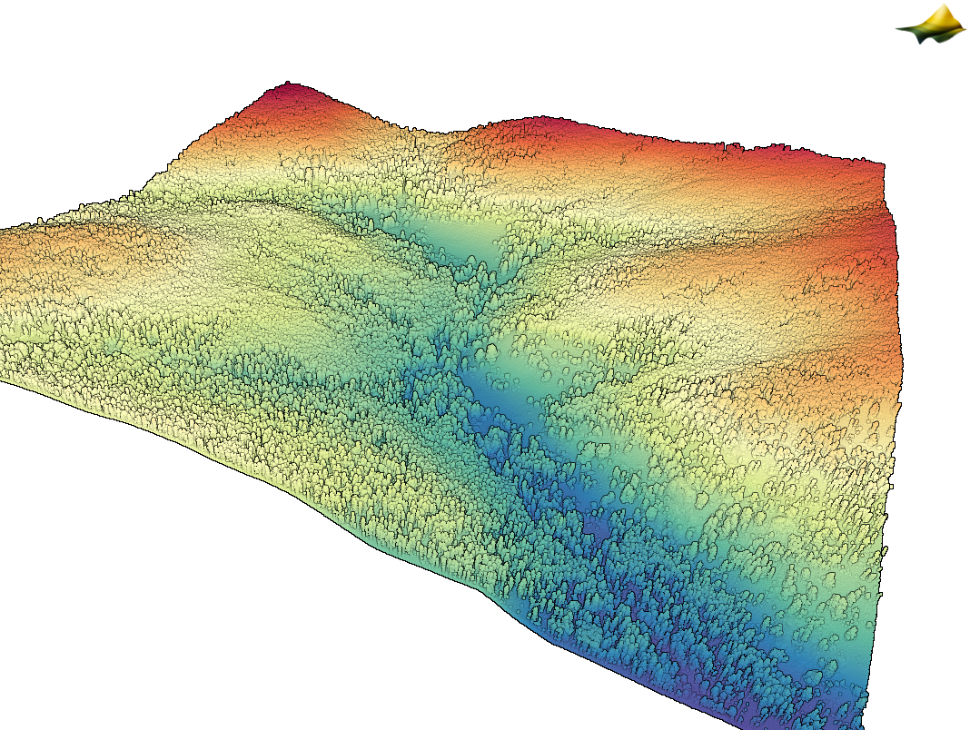 3D point cloud colored by elevation of the Little Beaver Creek Valley in Colorado. (Dataset: Lidar Survey of a Partially Burned Mountain Watershed, CO 2023).
