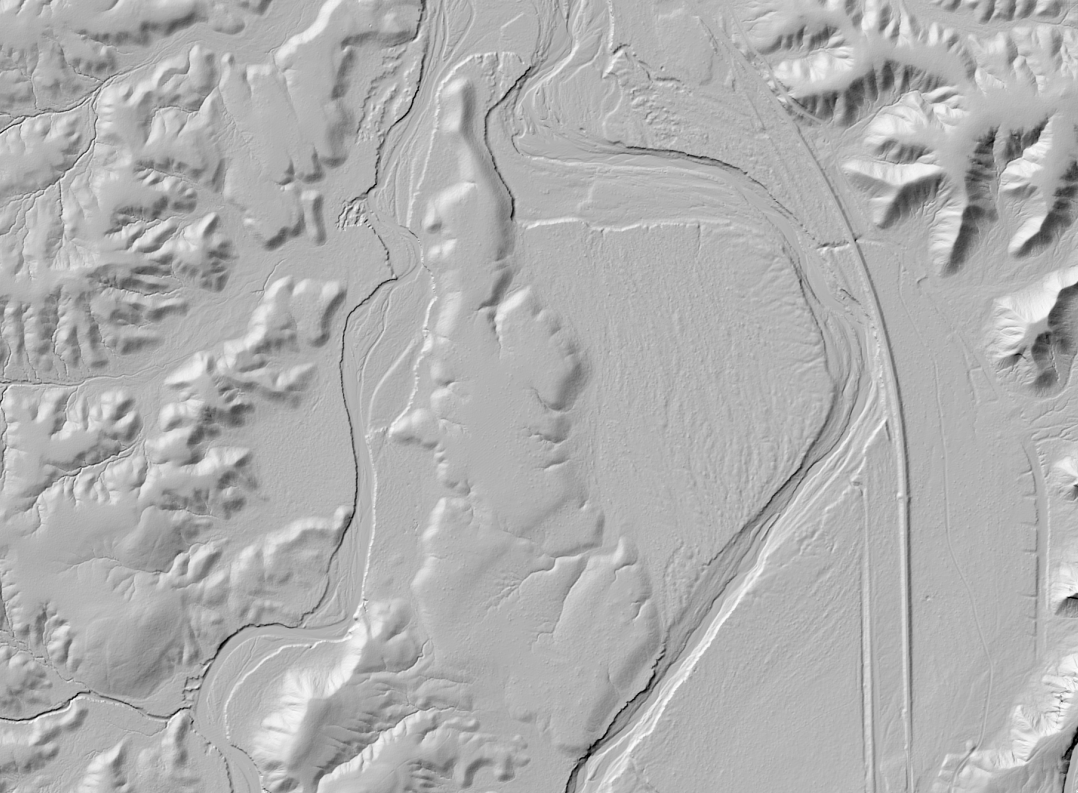 Contours overlaid on a hillshade of a Digital Terrain Model (DTM). Dinkey Creek is on left side of image (dataset: Topographic and Lithologic Controls on Subsurface Weathering, CA 2021).