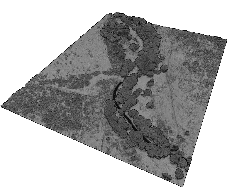 3D point cloud colored by intensity over a section of the San Pedro river in southern Arizona (dataset: Lidar Survey of the San Pedro River, AZ 2021).